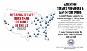 ABA member Coach USA/Megabus helps human trafficking victims by providing free tickets to help victims travel to another city along a Megabus route to reunify with the family, access special services or participate in the prosecution of their trafficker.
