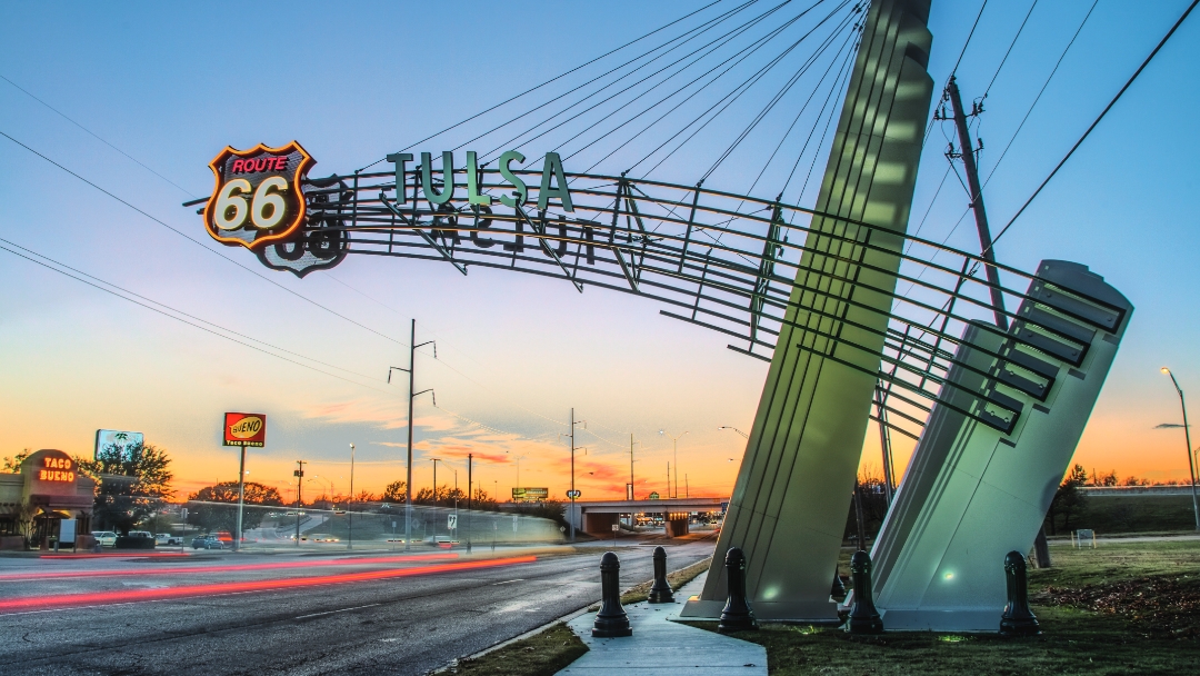 Route 66 runs right through downtown Tulsa, with arches bookending the East and West Gateways of town.