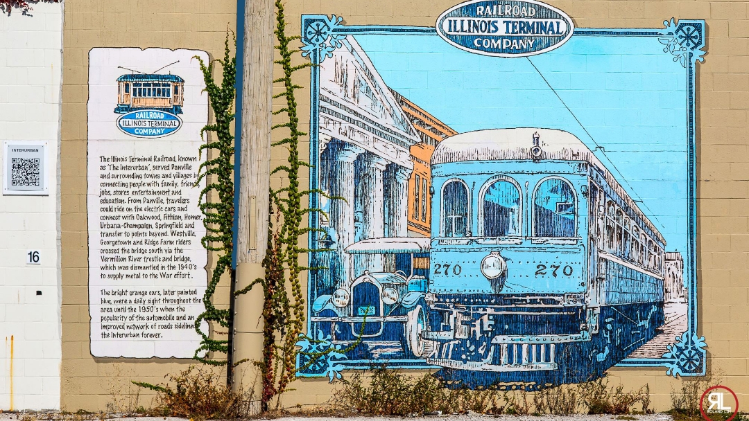 Electric rails meet rural charm—this mural showcases the interurban trolley system that connected Danville to towns across Illinois in the early 1900s.